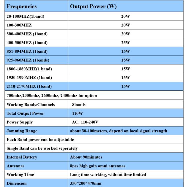 Jamming FrequenciesName : 2G/3G/4G/5G Mobile Phone + wifi+UHF/UHF Signal